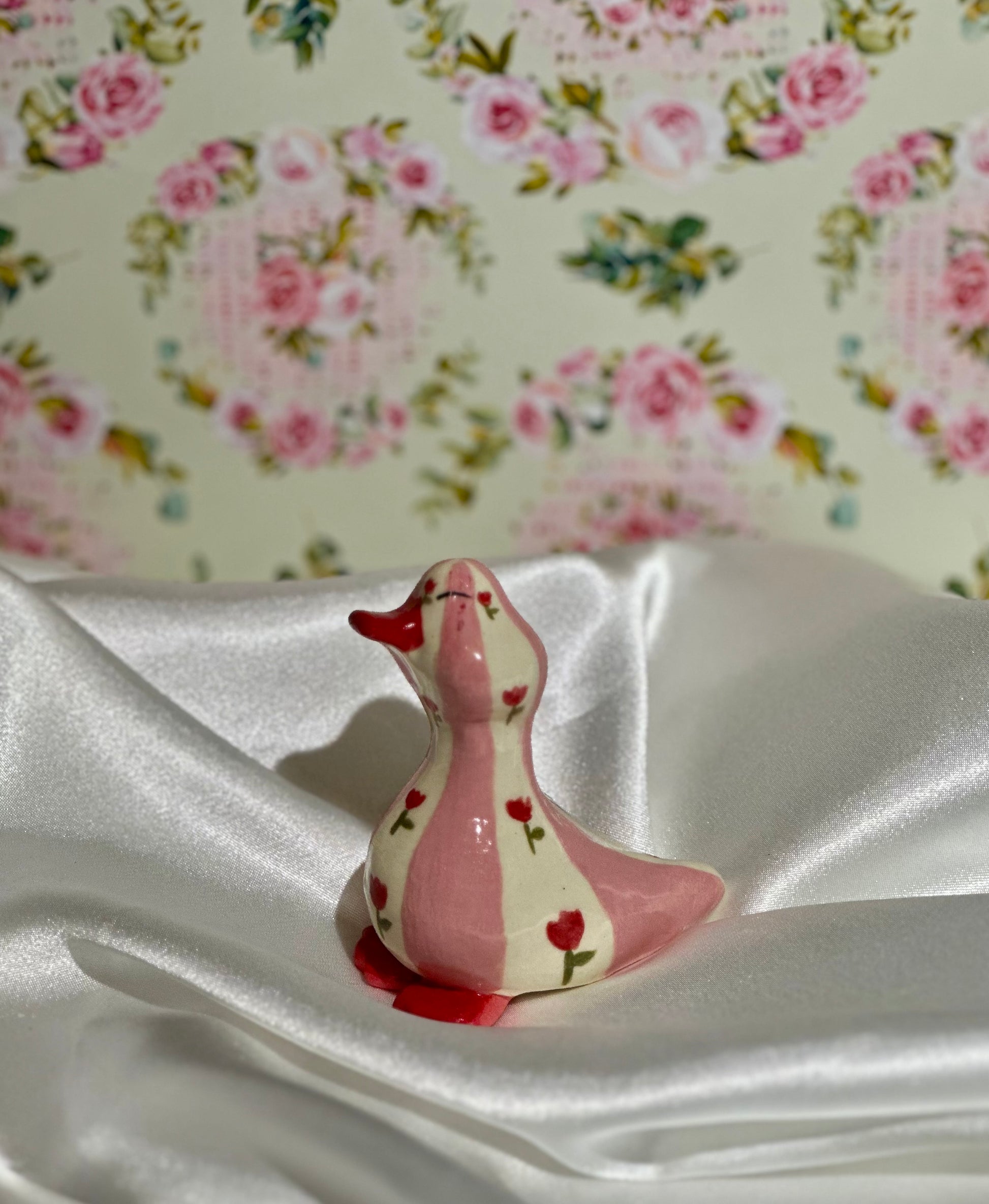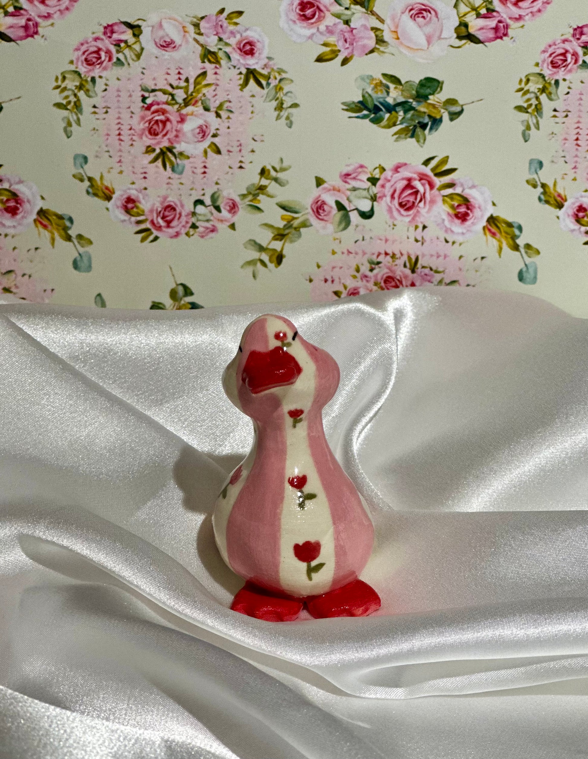 Bring a splash of whimsy to your space with this vintage wallpaper duck sculpture, featuring charming pink stripes. Its playful design adds a touch of nostalgia and fun to any room, making it a delightful conversation starter or a quirky accent piece. Perfect for those who love unique decor with a vintage twist.